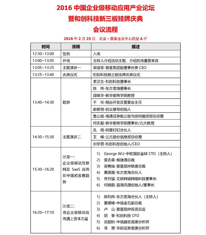 和創(chuàng)科技(證券代碼834218)作為中國(guó)企業(yè)級(jí)移動(dòng)互聯(lián)網(wǎng)SaaS應(yīng)用第一股,是在和創(chuàng)科技各位股東、客戶、合作伙伴及團(tuán)隊(duì)的長(zhǎng)期支持和卓越努力下,服務(wù)了國(guó)內(nèi)近十萬家企業(yè)。作為產(chǎn)業(yè)級(jí)SaaS移動(dòng)應(yīng)用的領(lǐng)軍企業(yè),和創(chuàng)科技將聯(lián)合復(fù)星昆仲、東方富海、新華都商學(xué)院于2016年2月25日下午在北京國(guó)家會(huì)議中心共同舉辦“2016中國(guó)企業(yè)級(jí)移動(dòng)應(yīng)用產(chǎn)業(yè)論壇暨和創(chuàng)科技新三板掛牌慶典”,這即是答謝各位股東朋友們的長(zhǎng)期支持,也是剖析產(chǎn)業(yè)級(jí)SaaS行業(yè)在產(chǎn)品研發(fā)、市場(chǎng)營(yíng)銷、運(yùn)維續(xù)費(fèi)和資本進(jìn)入等方面的行業(yè)主題。