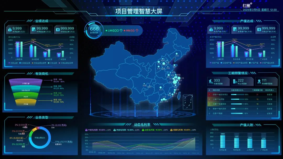 其中,紅圈即將上線的工程智慧大屏,可以集成多個業(yè)務版塊的數據,如成本、進度、資金、合同、質安等,提供直觀、全面的數據展示,讓管理者免去手機操作、輕松獲取項目一攬信息,從而做出有效決策。