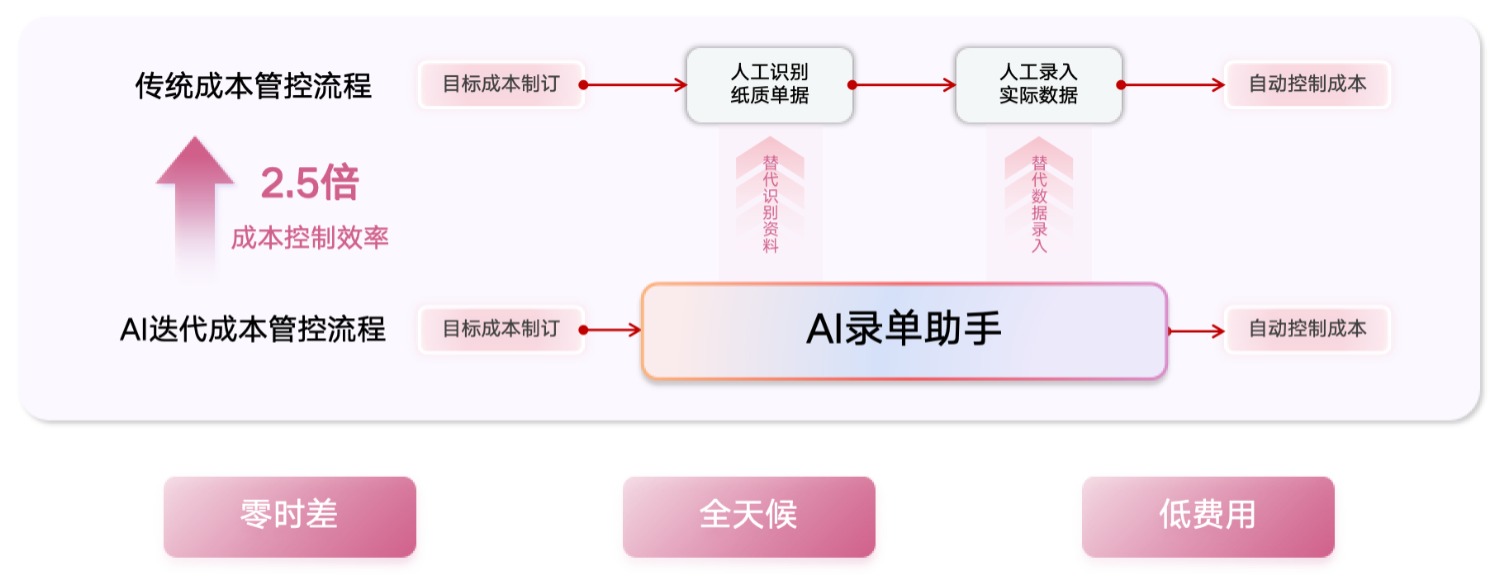 目標(biāo)成本制訂 → AI錄入助手(替代識別資料、替代數(shù)據(jù)錄入) → 自動控制成本