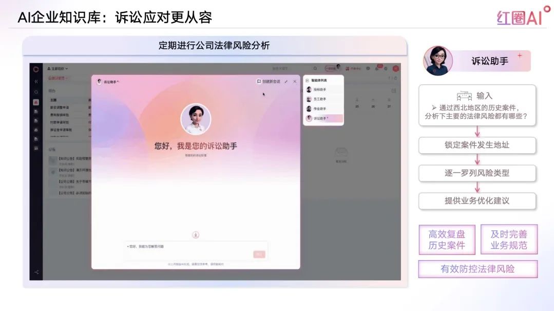 AI定期進行公司法律風險分析,訴訟助手高效復盤歷史案件,及時完善業務規范,有效防控法律風險。