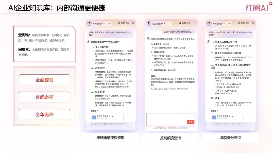 企業在經驗傳承上往往面臨資料分散、查找困難、更新滯后等難題。紅圈AI通過構建知識向量數據庫,將分散在文檔、郵件、制度、系統中的“碎片知識”智能歸集,并支持自然語言提問,3秒獲取精準答案,真正實現“人人皆可答,事事有依據”。