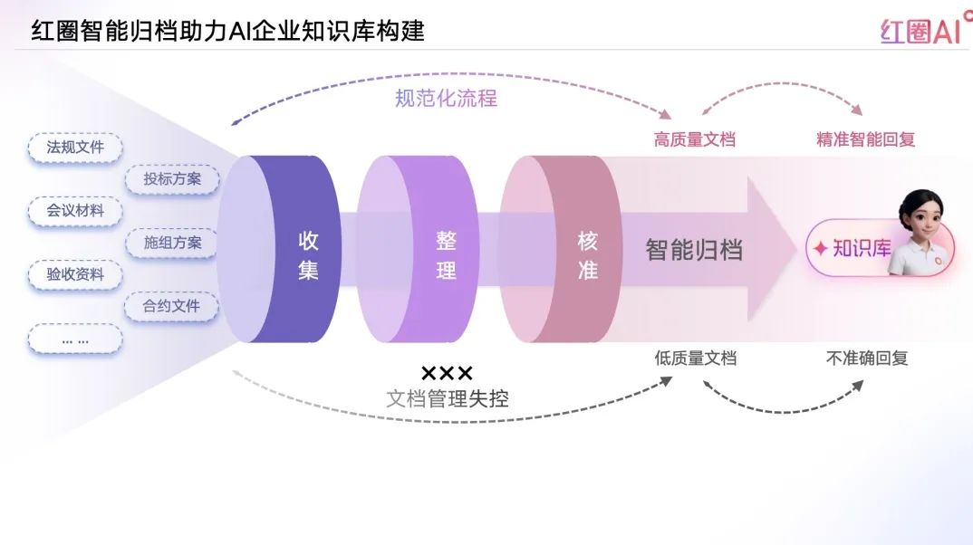 通過精準分類、統一歸集、秒級同步,紅圈AI幫助企業在最短時間、最低成本內構建企業級知識體系,實現知識管理智能化、資產化、標準化。