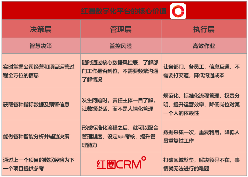 紅圈以助力企業營收為目的,首先站在決策者的角度,充分考慮老板的項目經營管理目標,制定符合目標的整體管理方案,然后圍繞執行部門的工作習慣做考量,搭建適合一線員工日常工作的操作流程,為組織賦能,讓管理簡單起來!真正助力企業實現標準化管理的目標。
