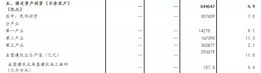 分產業看,第一產業投資14275億元,比上年增長9.1%;第二產業投資167395億元,增長11.3%;第三產業投資362877億元,增長2.1%。