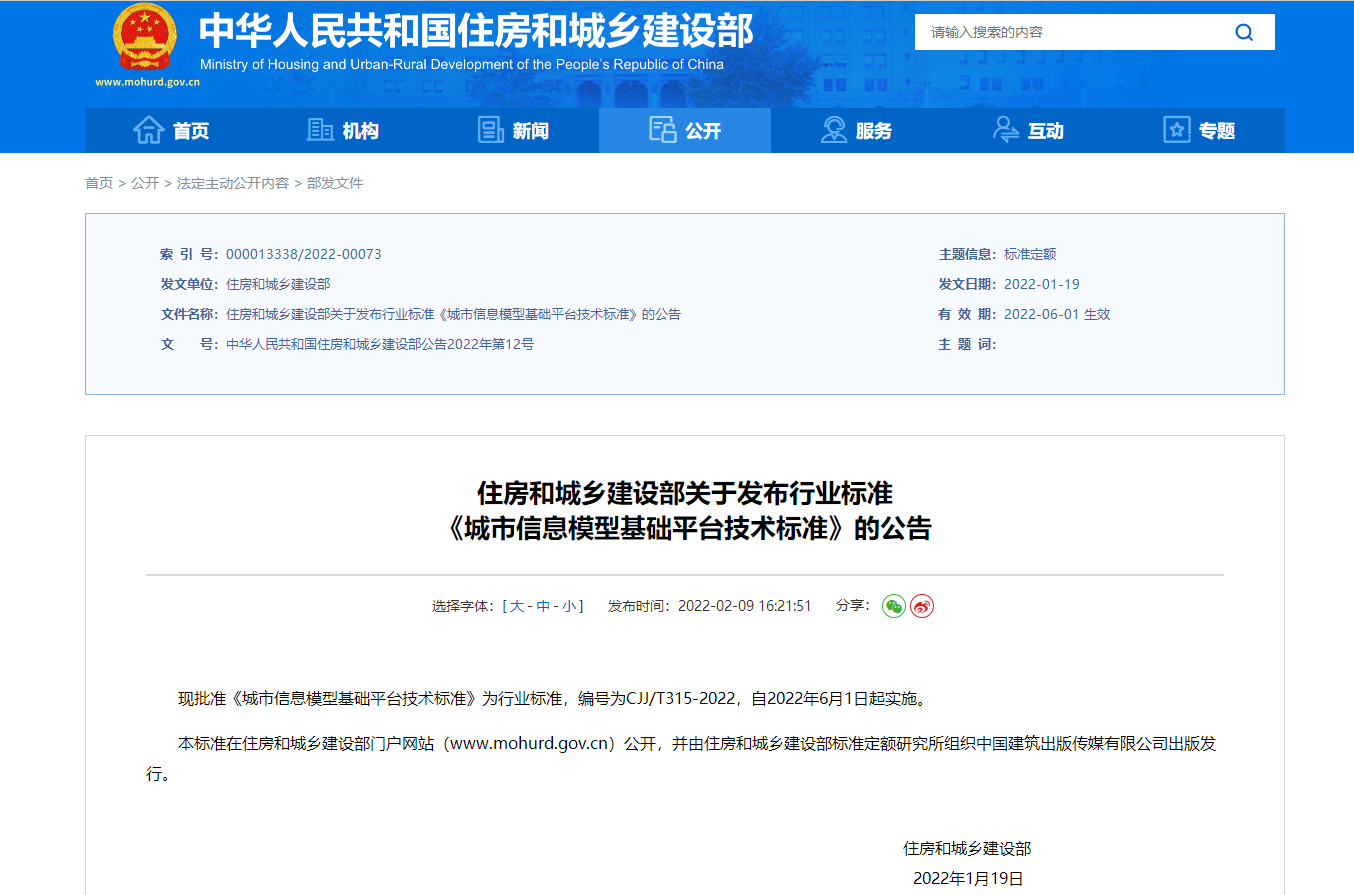 現(xiàn)批準《城市信息模型基礎(chǔ)平臺技術(shù)標準》為行業(yè)標準,編號為CJJ/T315-2022,自2022年6月1日起實施。
