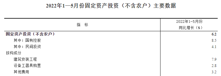 國家統(tǒng)計局發(fā)布數(shù)據(jù)顯示,1—5月份,全國固定資產(chǎn)投資(不含農(nóng)戶)205964億元,同比增長6.2%。其中,民間固定資產(chǎn)投資117128億元,同比增長4.1%。從環(huán)比看,5月份固定資產(chǎn)投資(不含農(nóng)戶)增長0.72%。