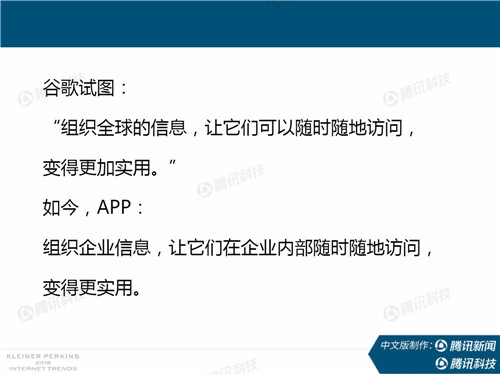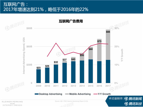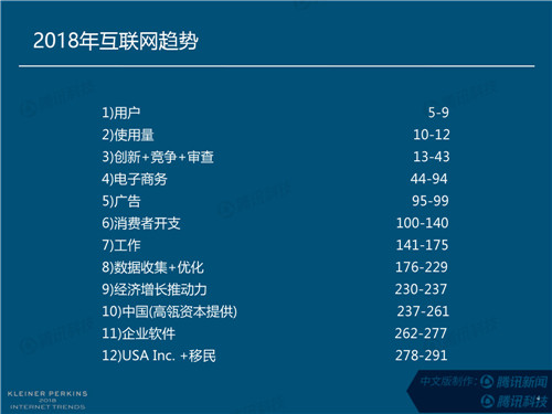 2018年互聯(lián)網(wǎng)趨勢報告正式發(fā)布,本次報告全面概括了2017年全球互聯(lián)網(wǎng)發(fā)展趨勢,從用戶、電商、廣告、消費支出、數(shù)據(jù)獲取和優(yōu)化、經(jīng)濟增長驅(qū)動力、中國市場、企業(yè)軟件等12個章節(jié)。