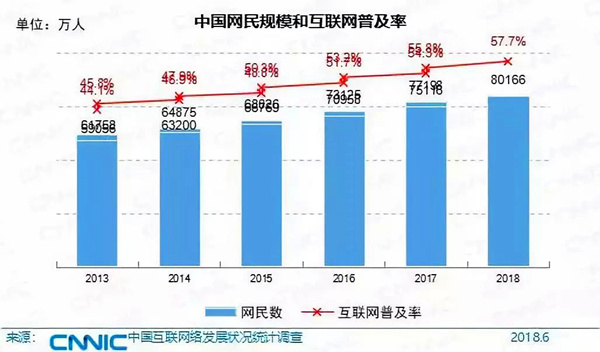 截至2018年6月,我國網民規模為8.02億,上半年新增網民2968萬人,較2017年末增加3.8%,互聯網普及率達57.7%。