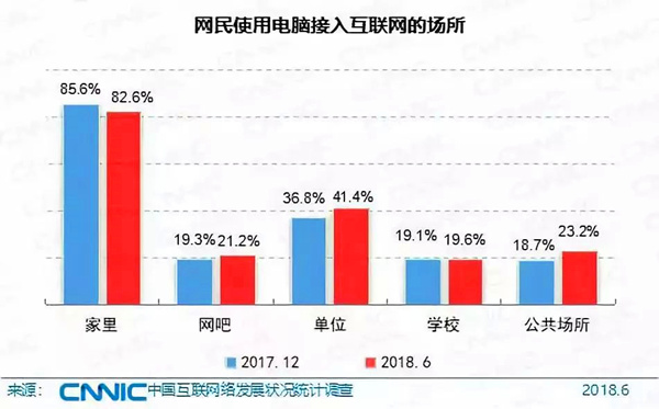 同樣,我國網民在家里通過電腦接入互聯網的比例為82.6%,與2017年末相比降低了3.0個百分點;在網吧、單位、學校、公共場所通過電腦接入互聯網的比例分別增長了2.0、4.6、0.5、4.5個百分點。在上網時長方面,2018年6月,中國網民的人均周上網時長為27.7小時,相比2017年末提高0.7個小時。
