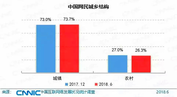 截至2018年6月,我國農村網民規模為2.11億,占整體網民的26.3%,較2017年末增加204萬人,增幅為1.0%;城鎮網民規模為5.91億,占比達73.7%,較2017年末增加2764萬人,增幅為4.9%。我國不斷推進城鎮化進程,使得城鎮人口不斷增加,農村人口不斷減少,城鄉網民結構受此影響也發生了細微變化。