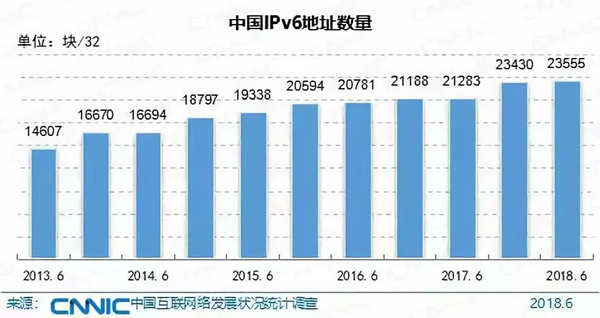 截至2018年6月,我國IPv6地址數量為23555塊/32,半年增長0.53%。