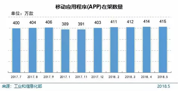 截至2018年5月,我國市場上監測到的移動應用程序(app)在架數量為415萬款。
