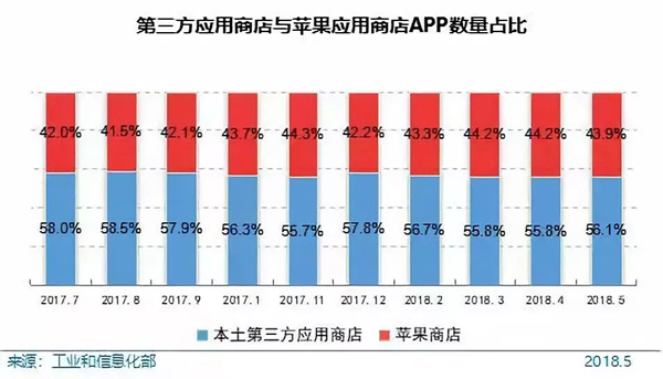 其中,我國本土第三方應用商店移動應用數量超過233萬款,占比為56.1%;蘋果商店(中國區)移動應用數量超過182萬款,占比為43.9%。