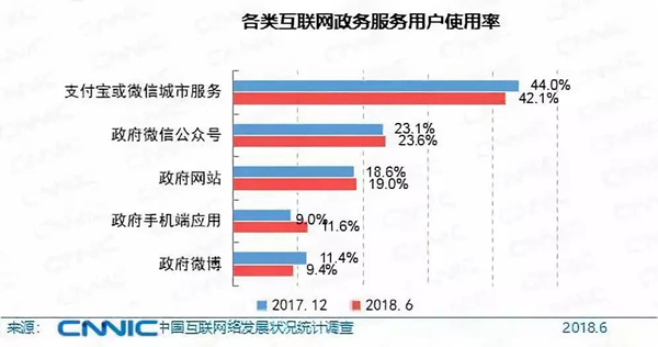 截至2018年6月,我國在線政務服務用戶規模達到4.70億,占總體網民的58.6%,有42.1%的網民通過支付寶或微信城市服務平臺獲得政務服務。