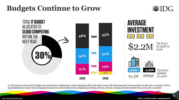 企業(yè)預(yù)計(jì)它們今年在云apps、平臺(tái)和服務(wù)中的評(píng)價(jià)投入為350萬美元。在接下來一年預(yù)算的分配中,30%分配給了云計(jì)算,其中大部分是SaaS(48%)、IaaS(30%)和PaaS(21%)。同時(shí),對(duì)云計(jì)算應(yīng)用和平臺(tái)的投資也在快速提升,對(duì)此企業(yè)的平均投資額達(dá)到220萬美元,高于2016年的162萬美元。
