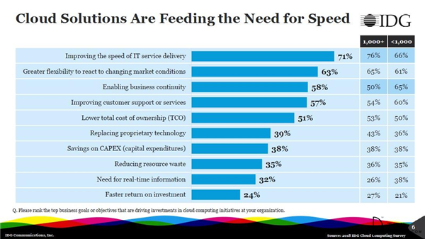 76%的大型企業(yè)正在尋求云應(yīng)用和平臺(tái)以加速IT服務(wù)的交付。多年來,云計(jì)算已經(jīng)被視作是一個(gè)降低成本的優(yōu)先策略,現(xiàn)在它已經(jīng)成為數(shù)字化業(yè)務(wù)模式的推動(dòng)者。IT部門要求快速交付云應(yīng)用及平臺(tái)組件的期望與壓力從未如此之高。而云投資的目的是為企業(yè)帶來更大的靈活性,以及它們對(duì)不斷變化的市場(chǎng)環(huán)境做出反應(yīng)的能力(63%的全體受訪者對(duì)此表示同意),從而推進(jìn)數(shù)字化業(yè)務(wù)模式的實(shí)現(xiàn)。