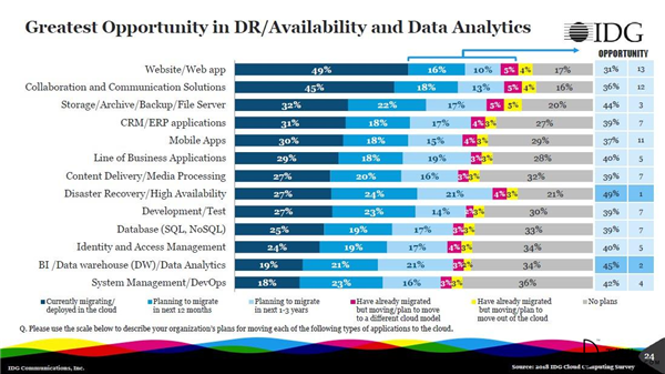 在所有的云應(yīng)用領(lǐng)域與遷移中中,數(shù)據(jù)分析和災(zāi)難恢復(fù)具有最大的機(jī)會(huì)。49%的組織計(jì)劃在未來一年到三年中將災(zāi)難恢復(fù)/高可用性系統(tǒng)遷移到云端。而45%的組織計(jì)劃在未來一年到三年中將BI、數(shù)據(jù)倉(cāng)庫(kù)和數(shù)據(jù)分析應(yīng)用遷移到云。目前,云計(jì)算正被視為一種增長(zhǎng)催化劑,它所支持的應(yīng)用程序正在消除企業(yè)收入增長(zhǎng)的障礙,并幫助它們?cè)诜€(wěn)定運(yùn)營(yíng)的同時(shí)獲得新客戶。