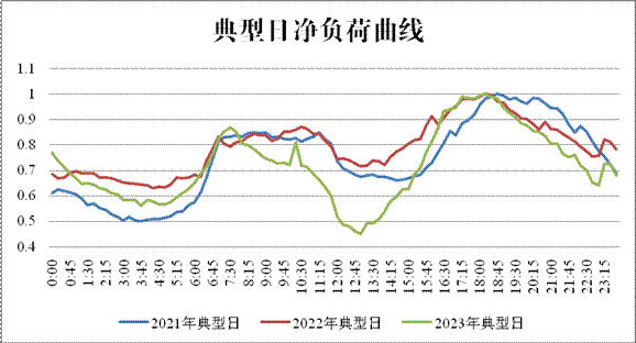 由于湖南光伏發(fā)電裝機的快速增長,湖南電網(wǎng)凈負荷曲線(電網(wǎng)凈負荷=電網(wǎng)負荷-新能源出力-外受電)產(chǎn)生向“鴨子型曲線”轉(zhuǎn)變的趨勢(見圖),午間腰荷時段凈負荷越來越低,該時段可再生能源消納困難情況開始顯現(xiàn)。以2023年某日為例,該日光伏發(fā)電出力較大,腰荷時段電網(wǎng)凈負荷較前兩年同期明顯下降,同時低于當日低谷時段凈負荷,導致腰荷時段新能源消納更為困難。