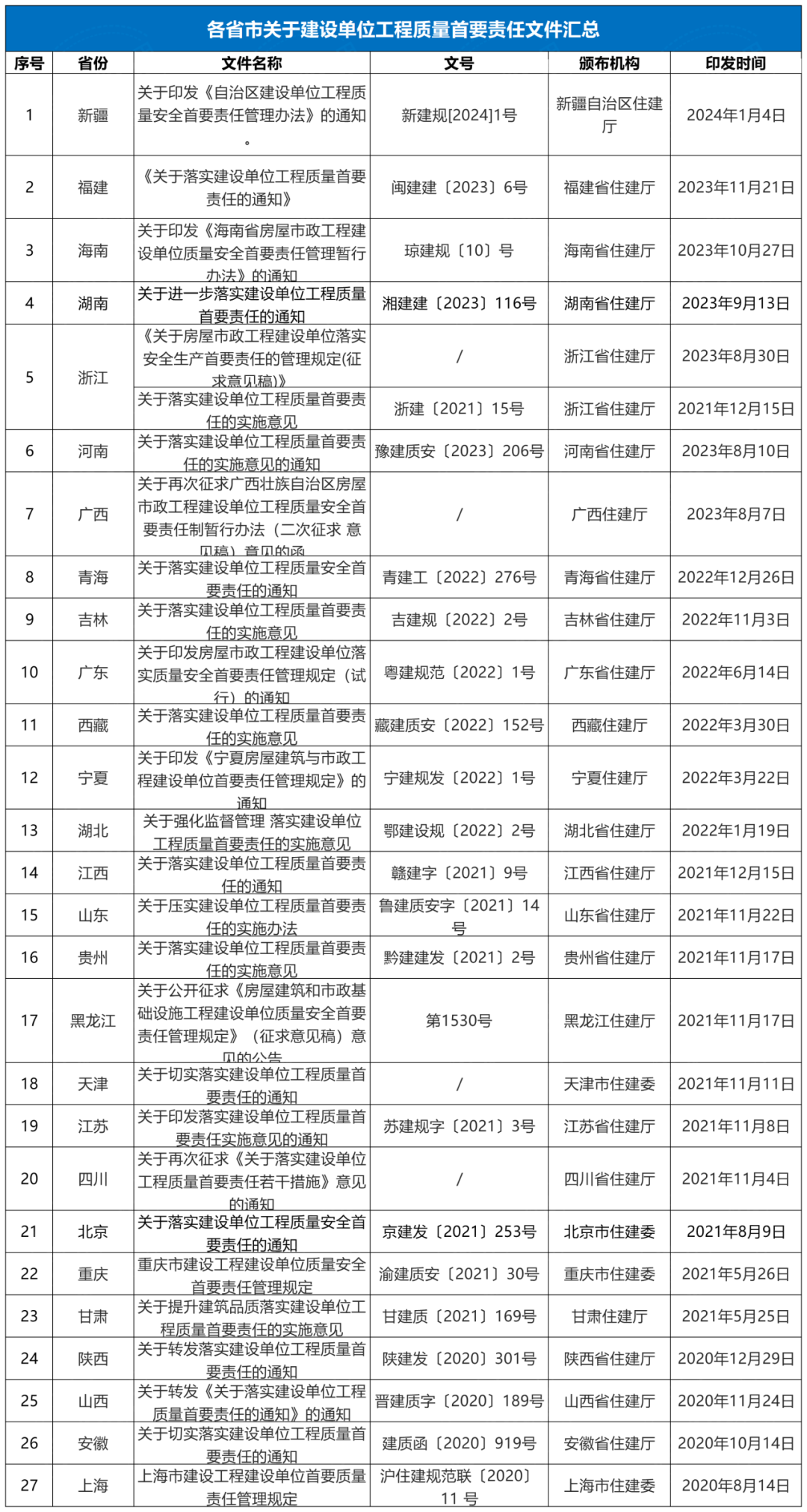 截至目前,27省市已經發(fā)文跟進住建部《關于落實建設單位工程質量首要責任的通知》(建質規(guī)〔2020〕9號),嚴格落實建設單位工程質量首要責任。