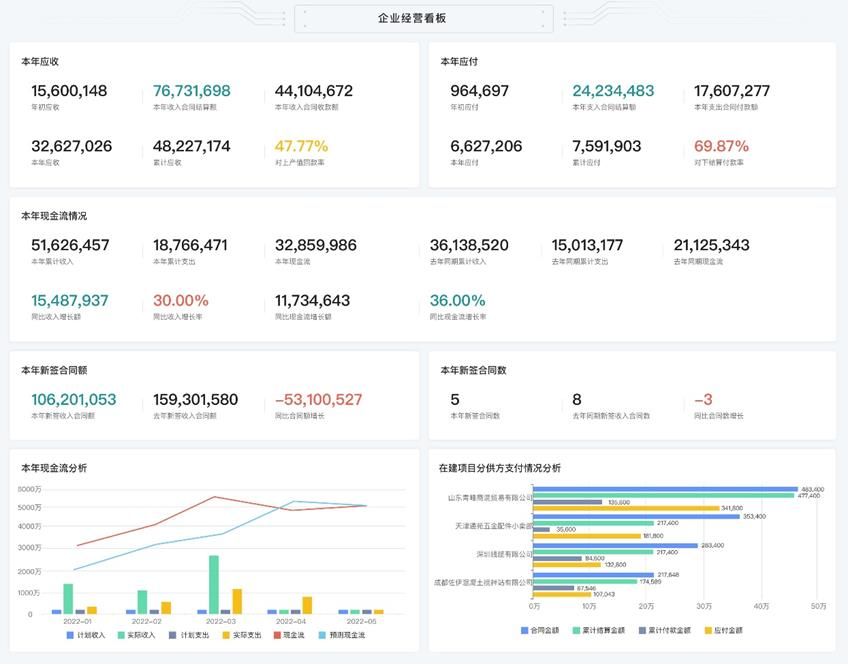 系統(tǒng)呈現公司級現金流看板+單項目收付款計劃/應收/應付/墊資等關鍵指標的數據穿透 |