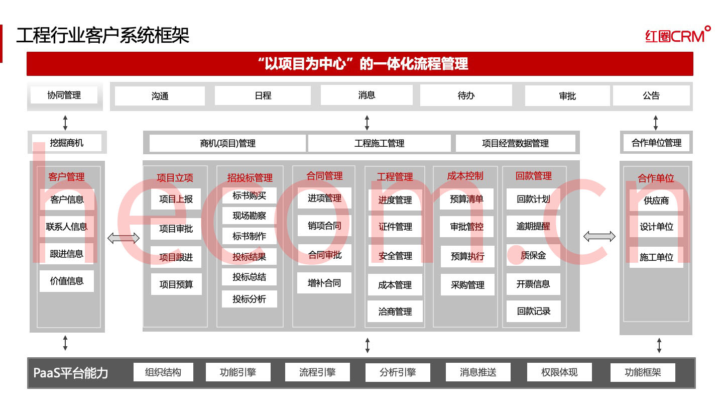 隨著市場經(jīng)濟(jì)的高速發(fā)展,企業(yè)間的競爭日趨激烈,深受政策影響的建筑工程企業(yè)也不例外,強(qiáng)化項(xiàng)目過程精細(xì)化管理,已經(jīng)成為建筑工程企業(yè)提升競爭力的重要途徑。紅圈借助互聯(lián)網(wǎng)、云計(jì)算、移動(dòng)大數(shù)據(jù)等技術(shù),基于自主研發(fā)的紅圈 PaaS 平臺(tái)推出了紅圈 CRM 建筑工程項(xiàng)目管理系統(tǒng),幫助建筑工程企業(yè)進(jìn)行業(yè)務(wù)流程梳理,打造以項(xiàng)目為中心的移動(dòng)管理平臺(tái),從而助力建筑工程企業(yè)在日益激烈的競爭中處于領(lǐng)先優(yōu)勢。紅圈 CRM 建筑工程項(xiàng)目管理系統(tǒng)適用于房建工程、市政工程、地基工程、水利工程、園林工程、環(huán)保工程、電力工程、道路工程等行業(yè)企業(yè)。
